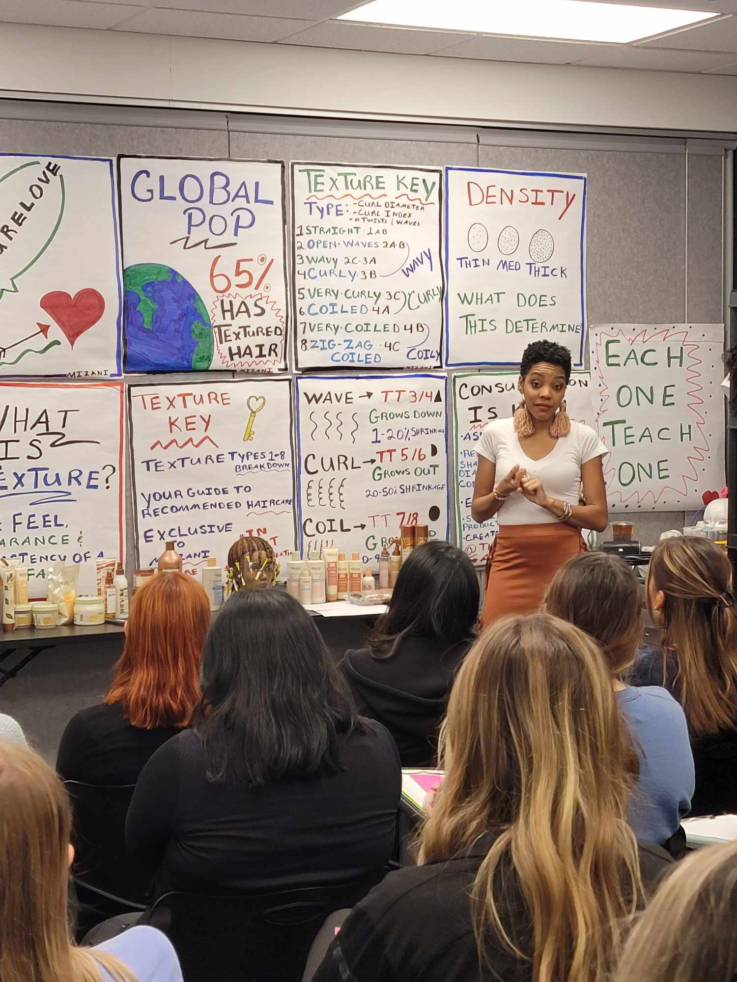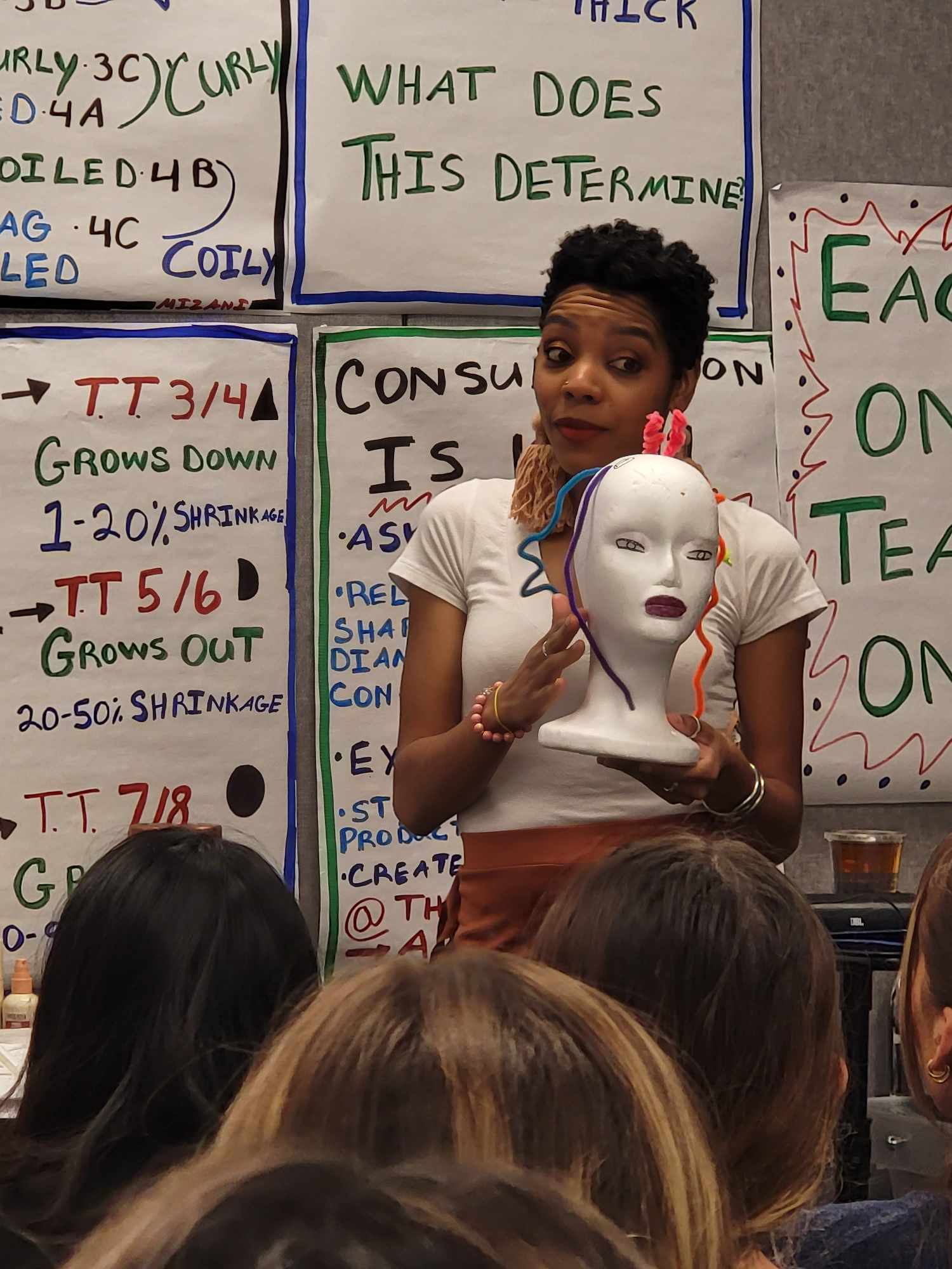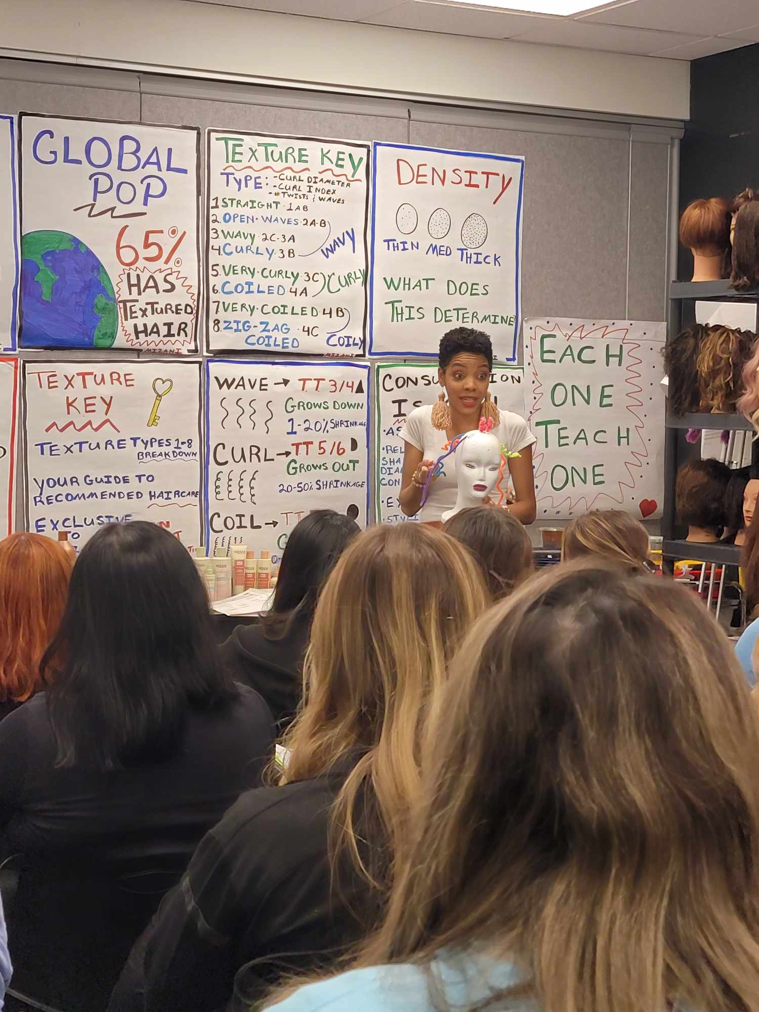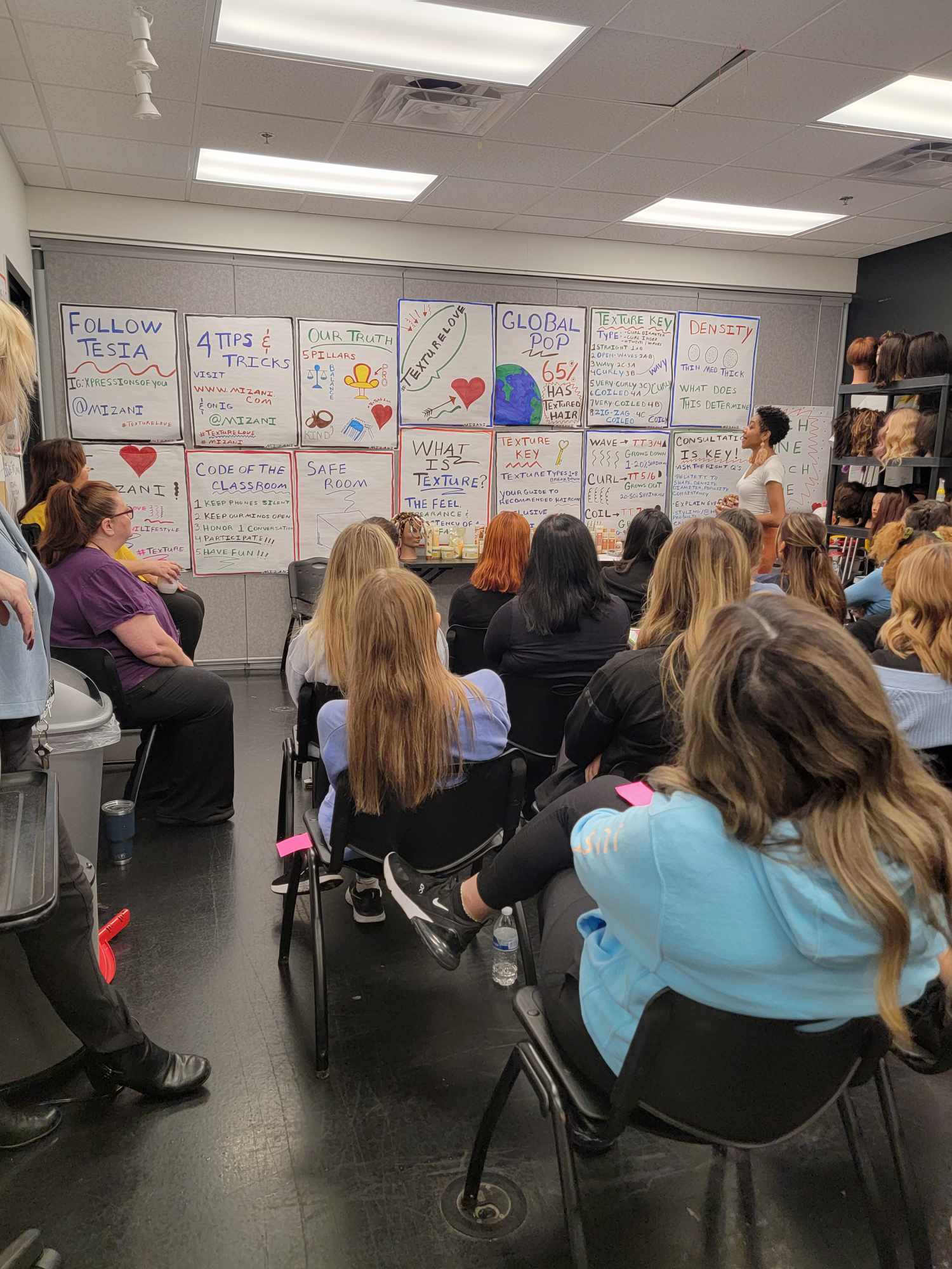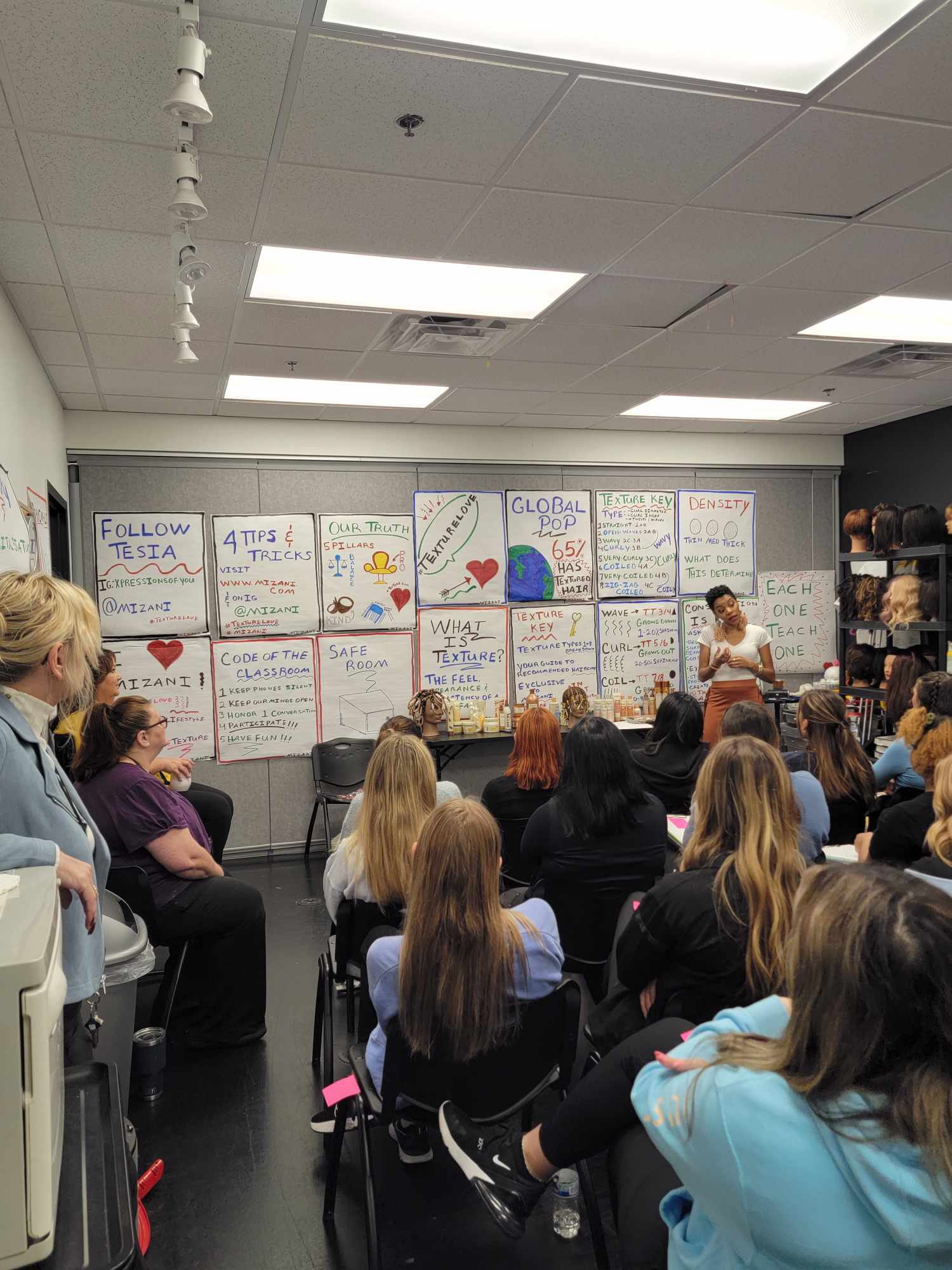 The session’s centerpiece was the hands-on demonstrations led by Tesia herself. With finesse and precision, she showcased a variety of techniques, custom-tailored to different texture types. The students observed with keen interest, witnessing the transformative power of expertly applied techniques. As Tesia deftly worked her magic, the room buzzed with excitement and inspiration. These demonstrations weren’t just about styling; they were about empowering future stylists to embrace the beauty of textured hair.