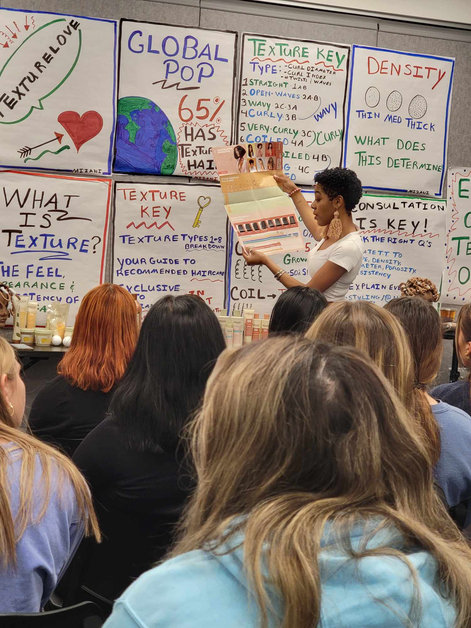Tesia began her session by introducing the students to Mizani’s comprehensive chart, which categorizes hair into eight distinct texture types. From the tightly coiled Type 8 to the loose waves of Type 2, each type comes with its own set of characteristics and care requirements. Tesia emphasized the importance of recognizing this diversity and tailoring treatments accordingly. By doing so, stylists can unlock the full potential of their clients’ natural hair, fostering confidence and self-expression.